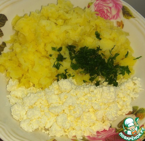 Для начинки картофель отварить "в мундире". Почистить, натереть на крупной тёрке. Смешать творог, картофель и измельченную зелень. Посолить по вкусу.