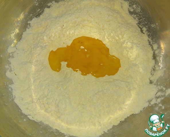 В миску насыпать всю муку. Смешать с солью. Сделать в центре небольшое углубление. Добавить масло. Слегка перемешать, чтоб масло впитало в себя муку. -