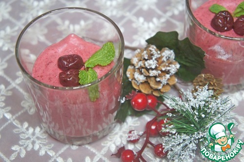 Разлить мусс по формам или бокалам и отправить в холодильник на 3-4 часа, чтобы он застыл. Готовый мусс украсить вишенками и листиками мяты.