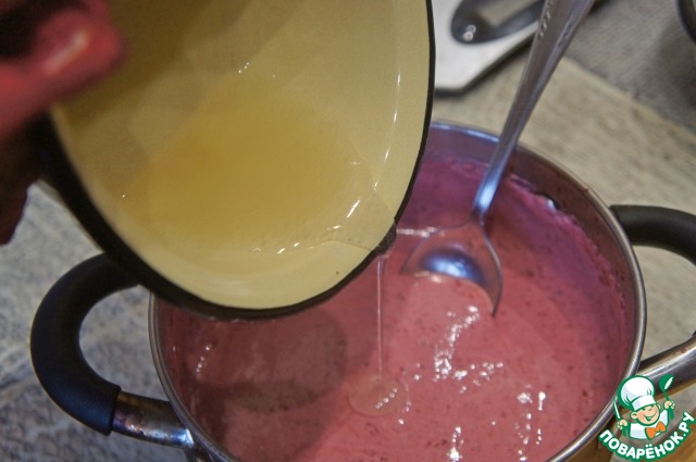 Протереть вишню сквозь дуршлаг. Для упрощения процесса можно пару раз добавить по ложке отвара.