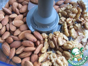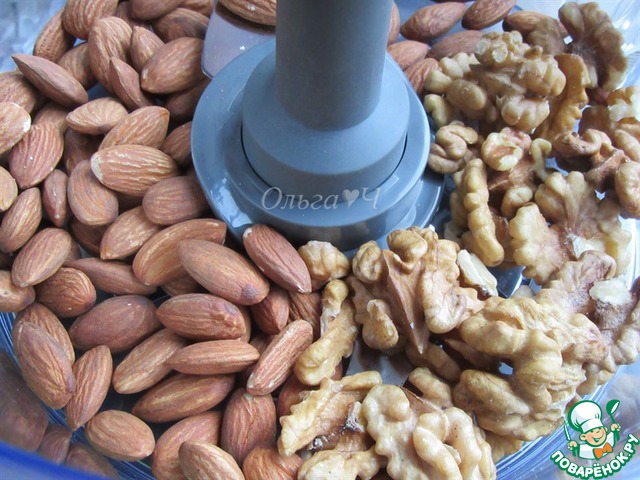 Приготовить основу для торта. Миндаль и грецкие орехи поместить в чашу кухонного комбайна с насадкой "Нож для измельчения".