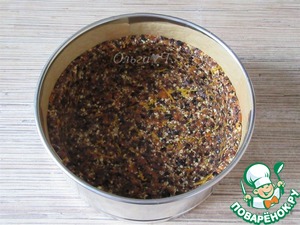 Форму для торта (у меня диаметром 16,5 см), застелить бумагой для выпечки, выложить ореховую массу с сухофруктами, распределить по дну, сделать бортики. Убрать в морозилку на 20-30 минут.
