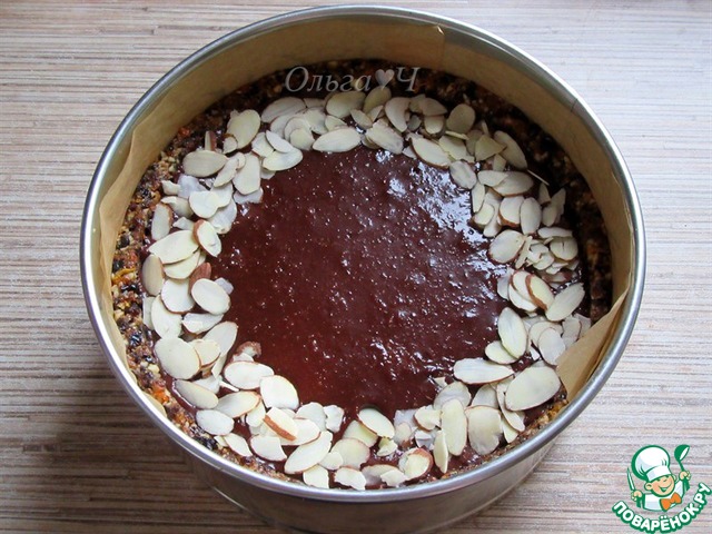 Выложить начинку в форму. Посыпать лепестками миндаля. Убрать в холодильник минимум на 2 часа или на ночь.