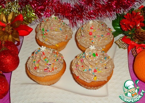 Кексы украсить кремом, применяя кулинарный шприц. Присыпать кондитерскими украшениями. Поставить десерт на 2 часа в холодильник.