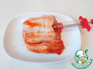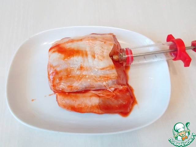 Теперь мы будим делать нашу уколотую свинину. Для этого нам понадобится специальный шприц, если у вас такого нет, приобретите, не пожалеете. Наполняем шприц массой и шприцуем наше мясо. Если у вас кусок не толстый, делайте это вдоль куска. Если толстый, то сверху вниз.