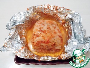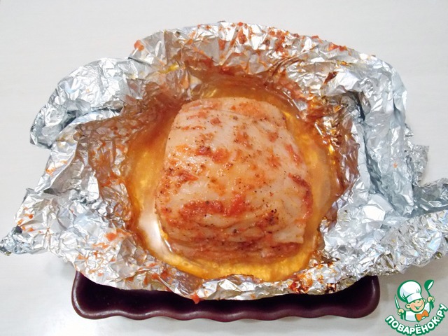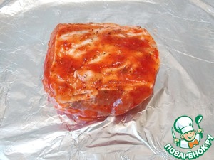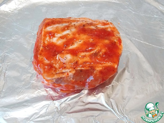 Берем большой кусок фольги и смазываем маслом. Кладем свинину и добавляем оставшийся соус.