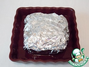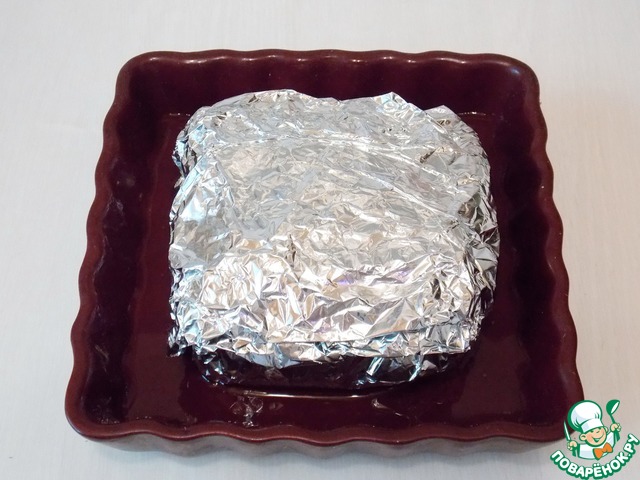 Плотно заворачиваем мясо в фольгу и укладываем в форму для выпечки. Нальем немного воды в форму, чтобы мясо не пригорело сразу.