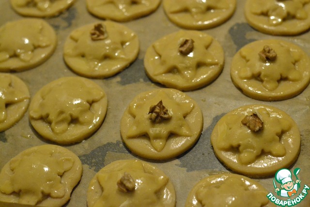 Смазать взбитым яйцом, сверху украсить кусочком ореха.