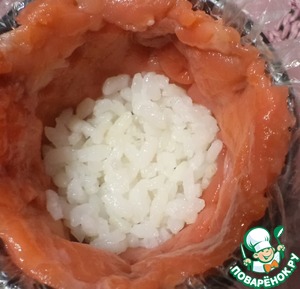 Давно я мечтала приготовить это блюдо! А мечты должны сбываться! И вот настал этот момент! Я приготовила закуску с нежной слабосоленой семгой взяв идею оформления в интернете, а за основу начинки свои вкусовые предпочтения. Мне нравятся роллы с названием "Яблочный фреш". Поэтому я начинила "Новогодний колокольчик"по аналогии состава ролла. Здесь будет уместно подать маринованный имбирь, вассаби и соевый соус. Сочетание семги, риса, мягкого сыра, и яблочка м-ммм очень вкусно!
