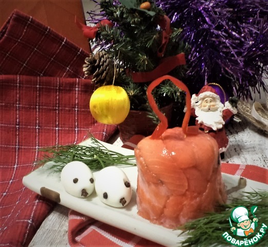 Сверху накрыть пищевой пленкой, поставить в холодильник минимум на 2 часа. Перед подачей пленку снять, форму перевернуть и выложить закуску на тарелочку. Из красного перца смастерить петельку для нашего "колокольчика". Закрепить его сверху с помощью зубочисток. Украсить веточками укропа и "мышками" из перепелиных яиц. Счастливого Нового Года!!!