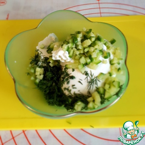 Свежий огурец нарезать мелким кубиком, укроп измельчить и все добавить к творожному сыру.