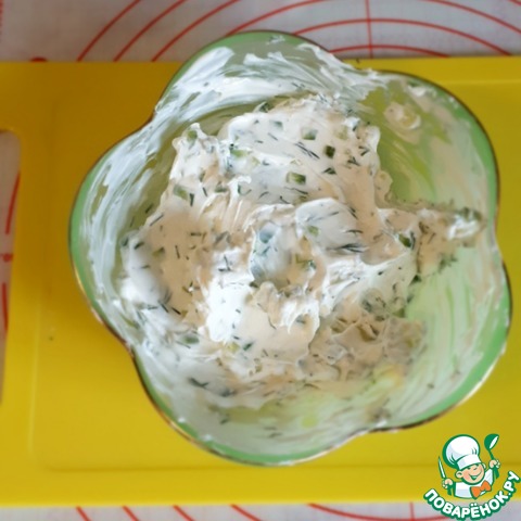 Все хорошо перемешать, это будет намазка на блин. Чтобы она хорошо намазывалась можно добавить 1 ст. л. сметаны.
