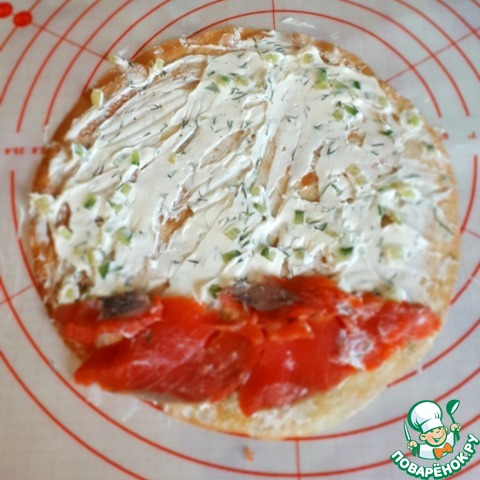 Берем блин, намазываем творожную намазку, укладываем рыбу, у меня была подкопченная малосоленая нерка.