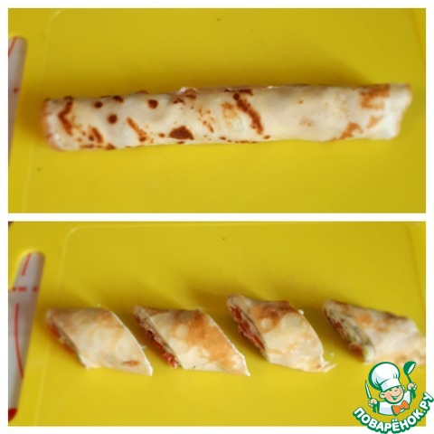 Сворачиваем блин рулетиком и нарезаем наискосок на небольшие порции.