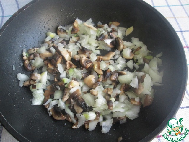 Вычищенный из середины лук нарезать и обжарить на растительном масле с мелко нарезанными шампиньонами.