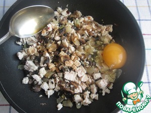 Варёную куриную грудку мелко нарезать и добавить на сковороду.