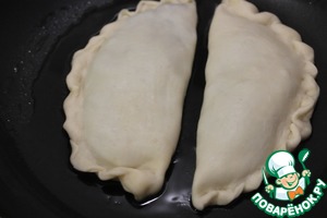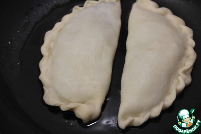 Жарить с двух сторон на разогретой сковороде с добавлением масла до румяной корочки. Верхнюю сторону советую сразу пару раз наколоть вилкой иначе раздуваются чебуреки как шарики))