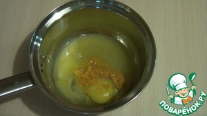 В сотейнике с толстым дном соединяем яйцо, сахар, сок апельсина (нам потребуется 60 мл) и цедру, перемешиваем до однородности. Добавляем сливочное масло, ставим на небольшой нагрев.