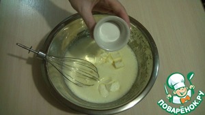 Добавить все остальные ингредиенты к взбитым с сахаром яйцам, кроме муки. Ставим на водяную баню, и помешивая добиваемся полного растворения сахара и масла.