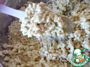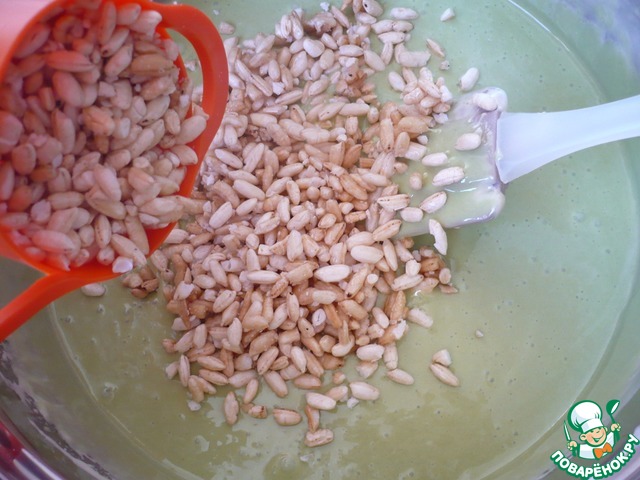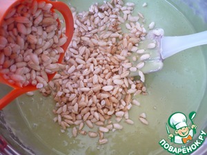 Снимите кастрюлю с огня, добавьте воздушный рис - за один раз добавляйте грамм по 30 и хорошо перемешивайте.