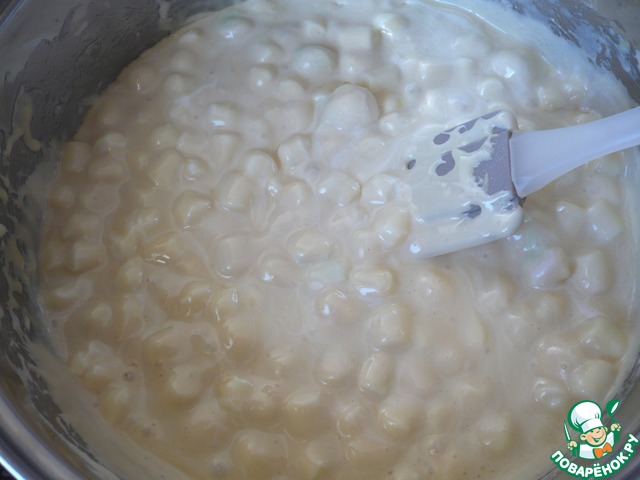 Во взбитый крем добавьте расплавленный маршмеллоу и ванилин. Все хорошо перемешать до гладкости. Крем переложите в кондитерский мешок с круглой насадкой.