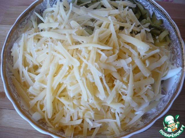 На крупной терке натереть твердый сыр и отправить в миску.