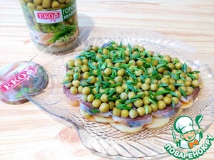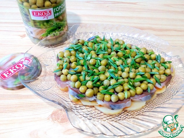 На сельдь уложить зеленый горошек ТМ ЕКО. Нарезать зеленый лук и разложить на зеленый горошек.