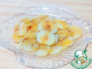 Отваренный заранее картофель в мундире почистить и нарезать кольцами 1см толщиной. Разложить кольца картофеля на блюдо и полить соевым соусом.