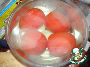 Помидоры надрезать крестообразно и залить кипятком. снять кожицу. нарезать кубиками.