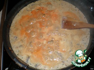 Отдельно обжарить шампиньоны. Добавить сливки, соль, молотый перец.
