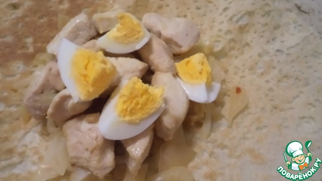 Рецепт «Мешочки с капустой, яйцом и цыпленком»: