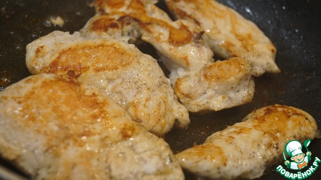 Кусочки филе разрежем вдоль, чтобы были потоньше, хорошо посолим и поперчим и обжарим на сковороде с каплей масла. Оставляем остыть.