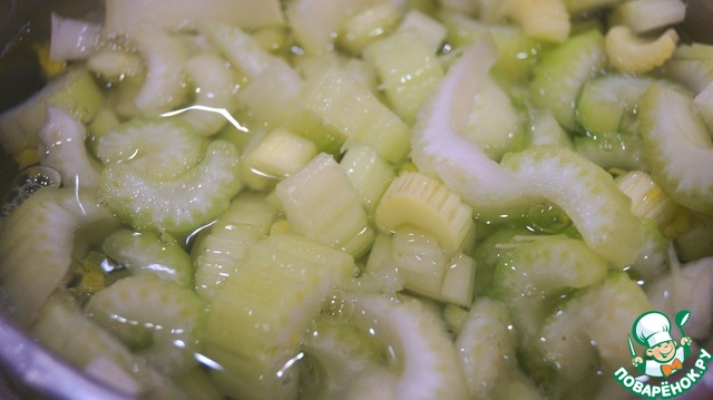 Складываем в глубокую миску и заливаем на полминуты кипятком. Сельдерей станет в разы ароматнее, кроме того некрасиво потемнеют невкусные или несвежие места, вы это увидите сами - отберите их и выбросьте. Воду слить, сельдерей остудить.