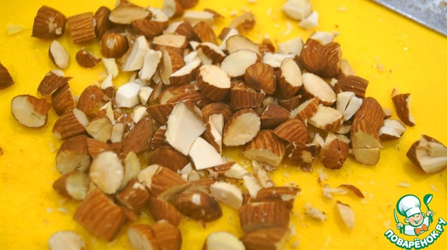 Миндаль слегка обжарить и крупно порубить ножом. Высыпать в глубокий салатник.