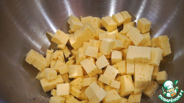 Сыр режем кубиками и отправляем к миндалю.