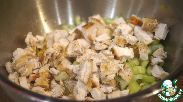 Нарезаем кубиками остывшее куриное филе - туда же.