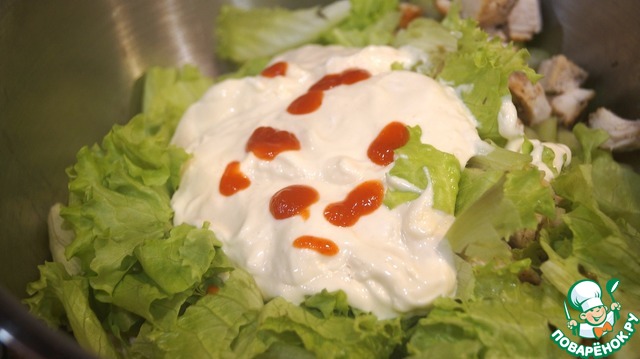 Добавляем майонез и капаем острым соусом.