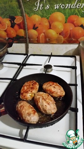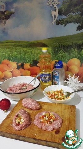 Ложкой отделяю куриный фарш примерно 100 гр и формую из него плоскую лепешку, в центр которой укладываю начинку. Защипываю края лепешки, закрывая начинку. Придаю форму в виде котлетки.