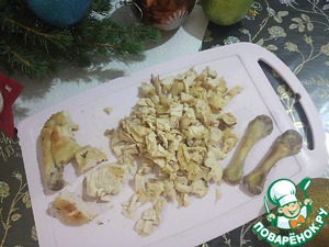 Мясо отделим от косточек и нарежем произвольно небольшими кусочками.