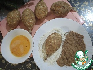 Каждую котлету обваливаем сначала в муке, затем окунаем в яйцо (яйца взбиваем вилочкой с щепоткой соли до однородности), затем обваливаем в панировочных сухарях.