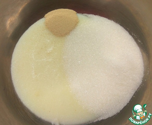 Смешать молоко и манную крупу. Сварить помешивая кашу. Остудить. В теплую кашу добавить быстродействующие дрожжи и сахар. Перемешать.