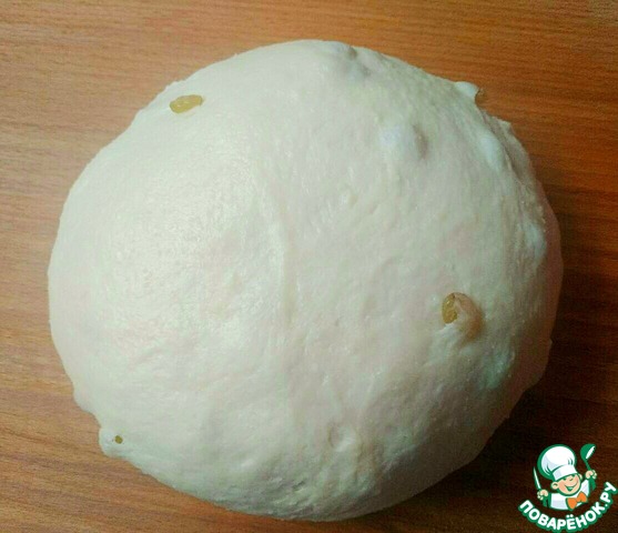 Частями добавлять к жидким ингредиентам муку и изюм, замесить нелипнущее тесто. Положить в миску, накрыть полотенцем и оставить на 1 час для подъёма. -