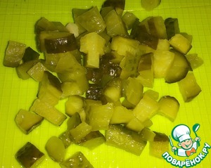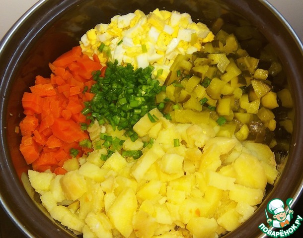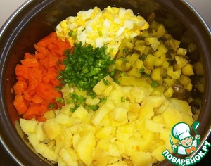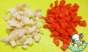 Морковь и картофель отварить в мундире. Почистить, нарезать небольшими кубиками.