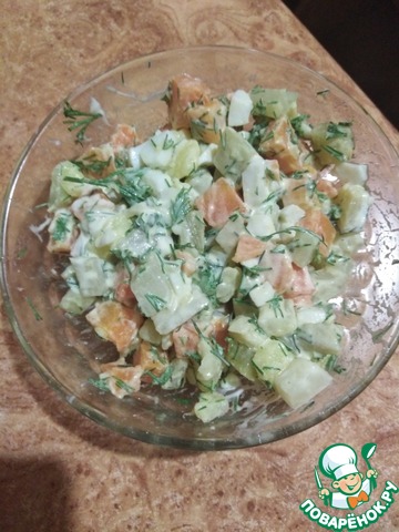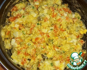 Добавить соль и перец по вкусу. Заправить майонезом. Переложить в салатник.