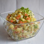 Мы всегда его готовим вместо традиционного Оливье, нашей семье он больше нравится. Мясо везде на столе, а этот салатик «полегче». Только мы добавляем сахарный мелкий горошек и немного зелёного лучка.