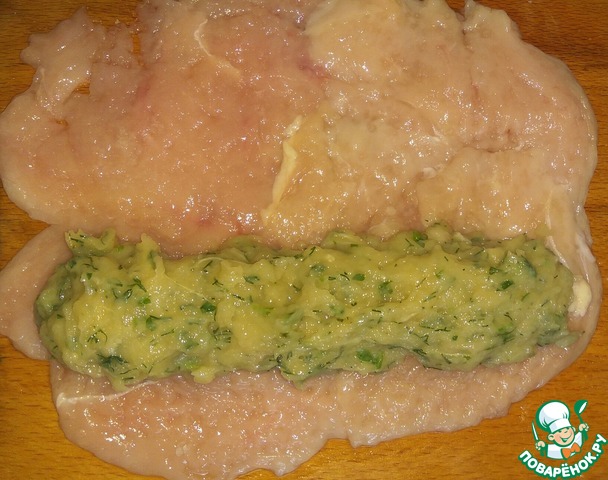 Крупное филе (350 г) разрезать вдоль, не дорезая до конца. Раскрыть как книжку и немного отбить. У меня было 2 маленьких филе. Я их разрезала, отбила слегка и выложила вплотную друг к другу. Посолить, поперчить по вкусу. Можно добавить специи для мяса.