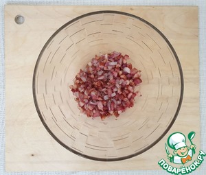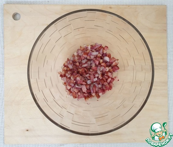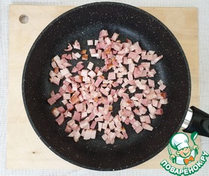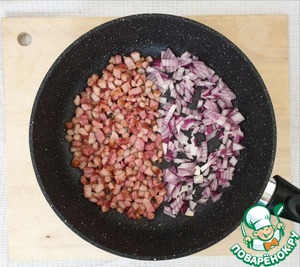 Когда жир из грудинки вытопится, добавим красный (репчатый) лук и обжарим все вместе несколько минут до мягкости лука.