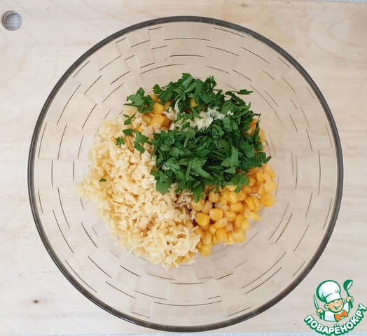 Добавим кукурузу, петрушку с чесноком и сыр. Перемешаем.