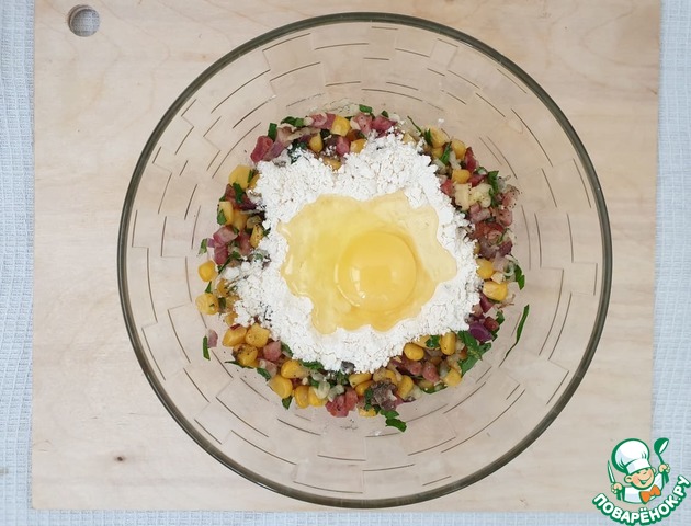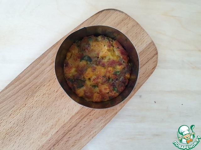 Чтобы фриттеры аккуратно смотрелись на праздничном столе, формуем с помощью кулинарного кольца подходящего диаметра.