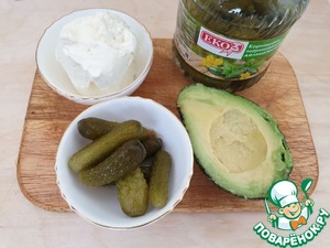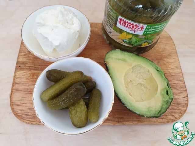 Для крема возьмем корнишоны маринованные деликатесные ТМ "ЕКО", спелый авокадо, творожный сыр